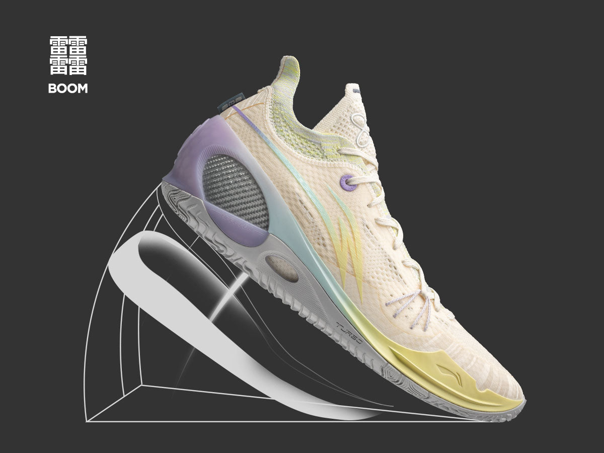 Made of a light, durable and ultra-responsive midsole material, LI-NING BOOM provides sporting players with higher responsiveness and better cushioning so that they can start faster and land safer. It also helps in accumulating more energy for dunking higher.